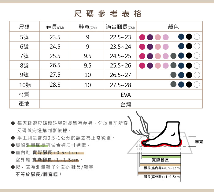 台湾制造 EVA柔软舒适材质/足弓设计减轻脚的负担 符合人体工学设计 防水止滑 耐压的一体成型结构